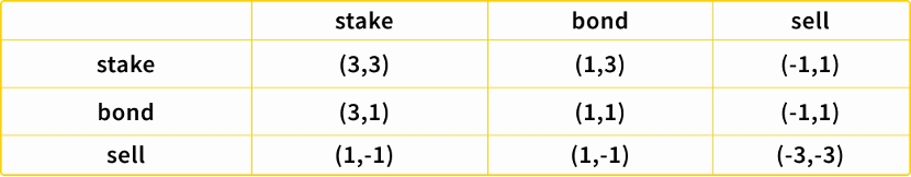 From the table above, we can see that the optimal strategy is for both players to cooperate, with both staking, resulting in a payoff of 6. If one buys bonds and the other stakes, the result is 4. Selling/staking and selling/buying bonds offset each other, resulting in a neutral payoff of 0. The worst outcome is when both players distrust each other and rush to sell, resulting in -6.