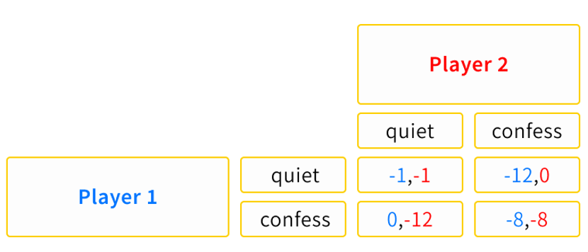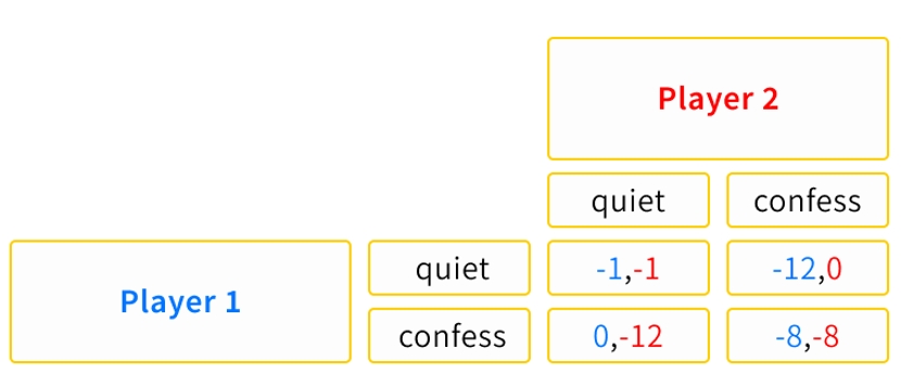 quiet ; confess ; Blue numbers represent Player 1's payoffs, red numbers represent Player 2's payoffs ; -1: 1 month of imprisonment ; -8: 8 months of imprisonment ; -12: 12 months of imprisonment;0: acquittal (no imprisonment);